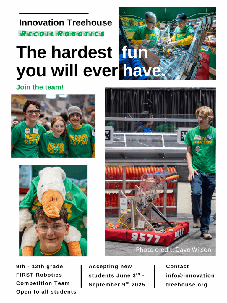 This is a year-round FIRST Robotics Competition team that consists of students ages 14-18 and several adult mentors. It is called “Recoil”.  We meet Tuesday evenings, once a week.  Our Build Season is January, February, and March and during those months we meet four times a week including all day on Saturday.