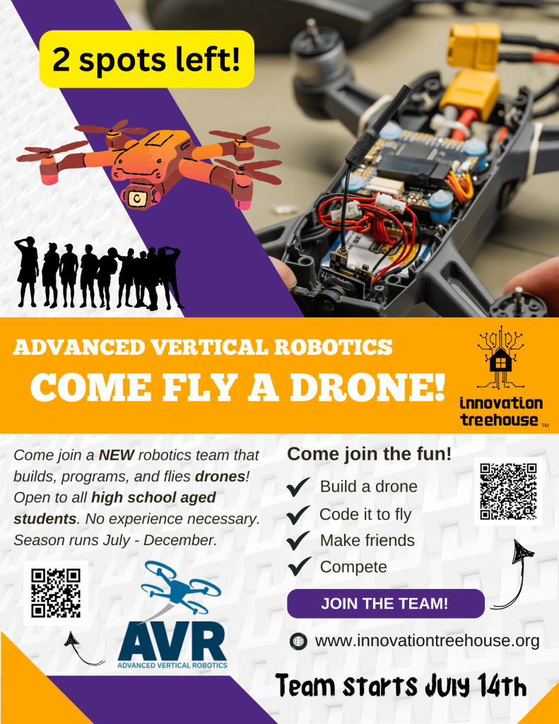 This is a brand new Advanced Vertical Robotics team that will be composed of 7 students age 14-18 and will be called “Rise”.  Come learn from our engineers!  The group is meeting Monday evenings and Saturdays from August – December.  The team will compete in November/December.